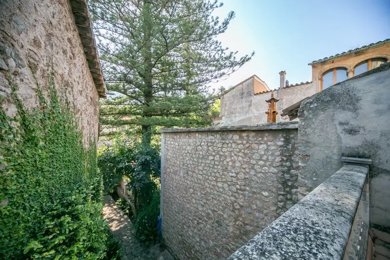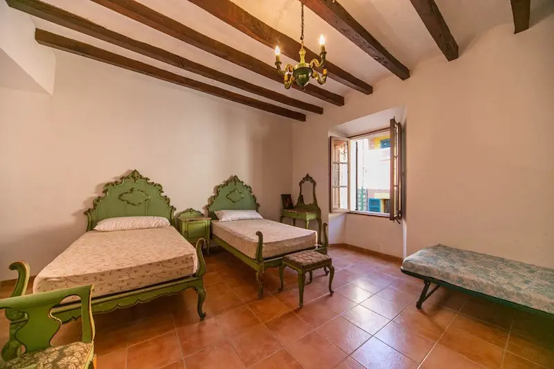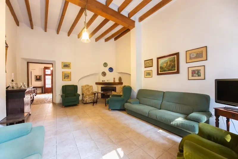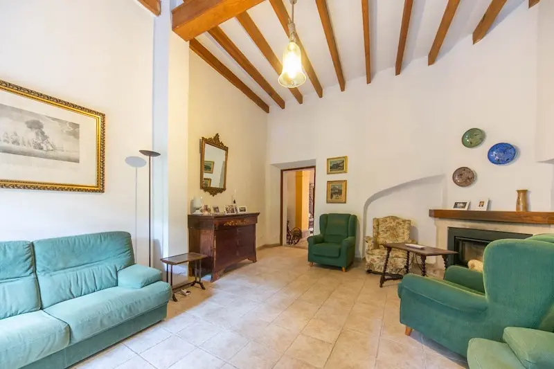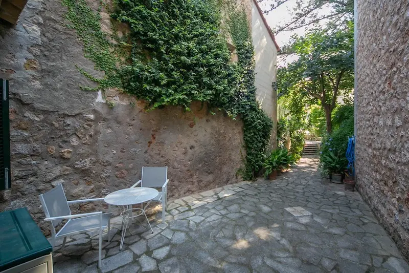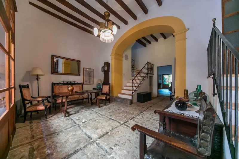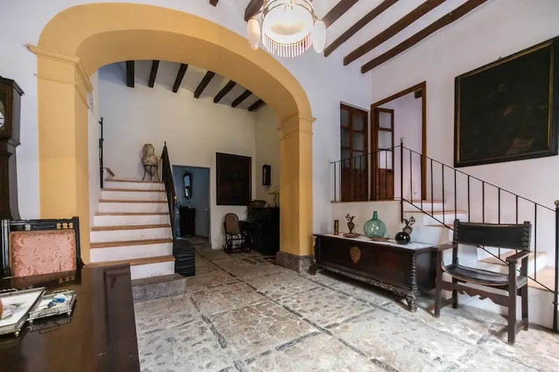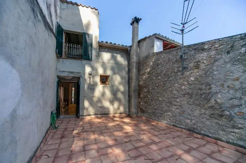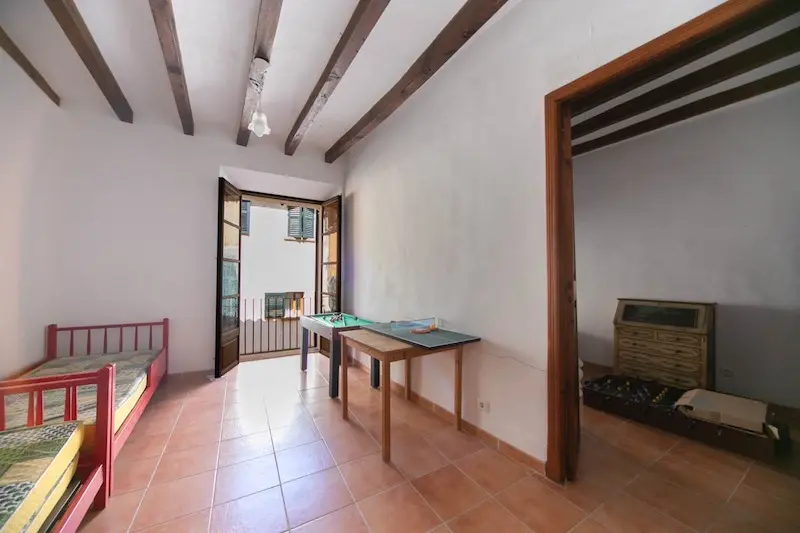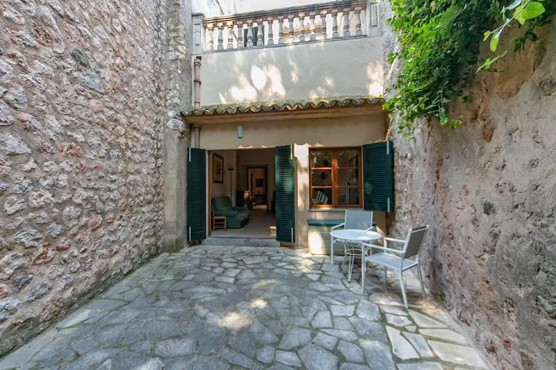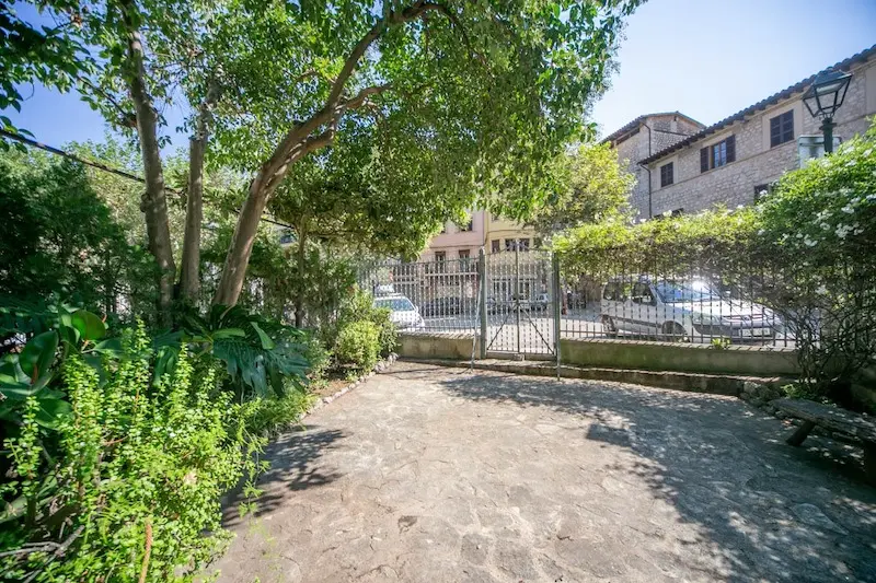 Céntrica casa de pueblo con entrada a dos calles en Sóller. Se ubica a escasos metros de la plaza de Sóller. Cuenta con la típica entrada con suelos de piedra, techos altos con vigas vistas y arco central. La escalera lateral conduce a un amplio dormitorio y un baño. En el nivel inferior encontramos la cocina. La gran entrada conduce al salón con chimenea y acceso al jardín, que dispone de salida trasera a la calle posterior. La primera planta se destina enteramente a dormitorios, uno de los cuales tiene acceso a una terraza y un baño privado. La última planta es un amplio espacio diáfano.
