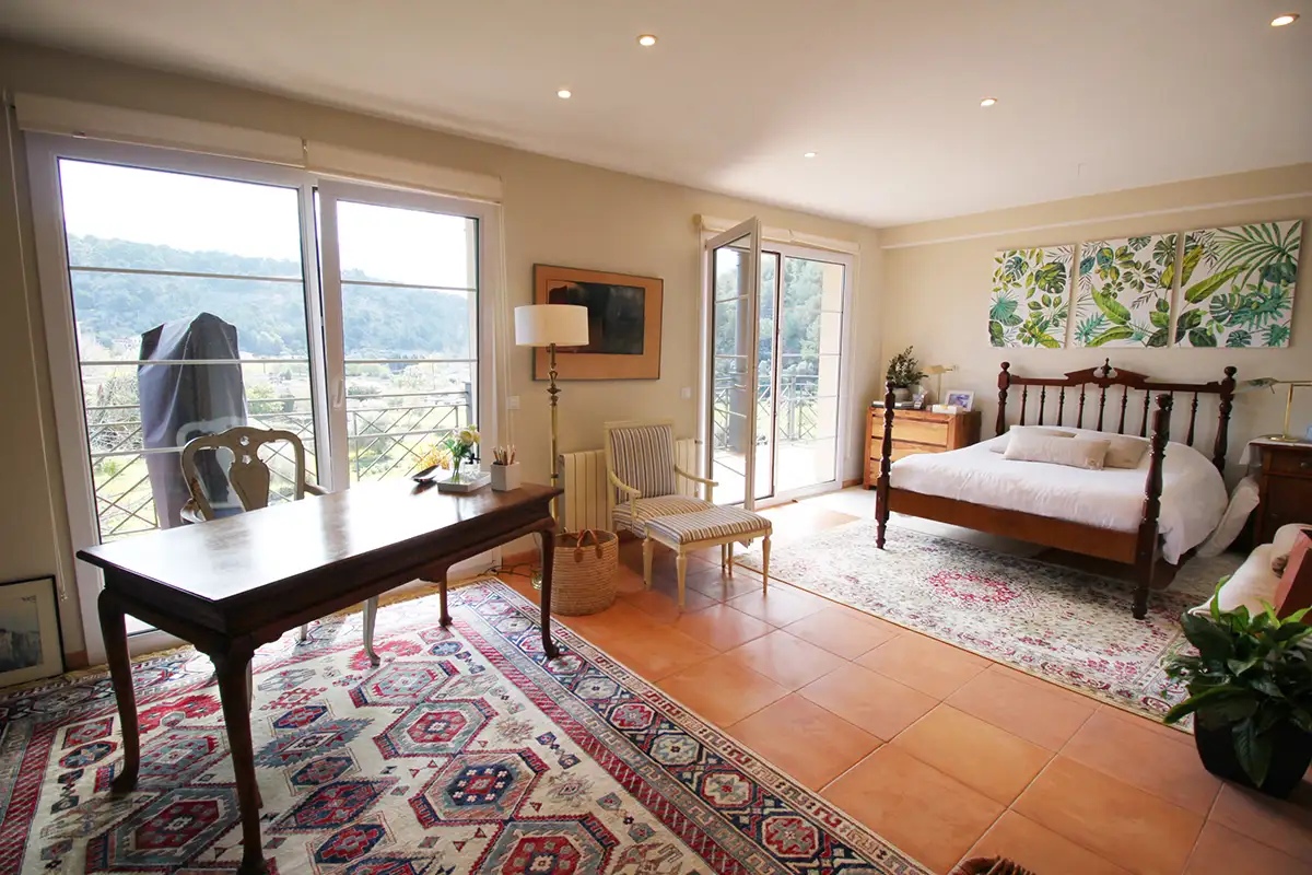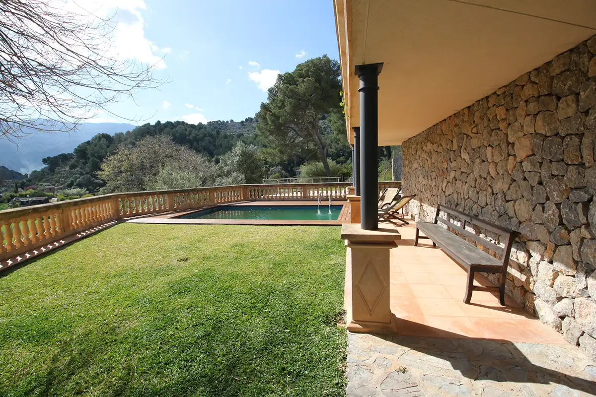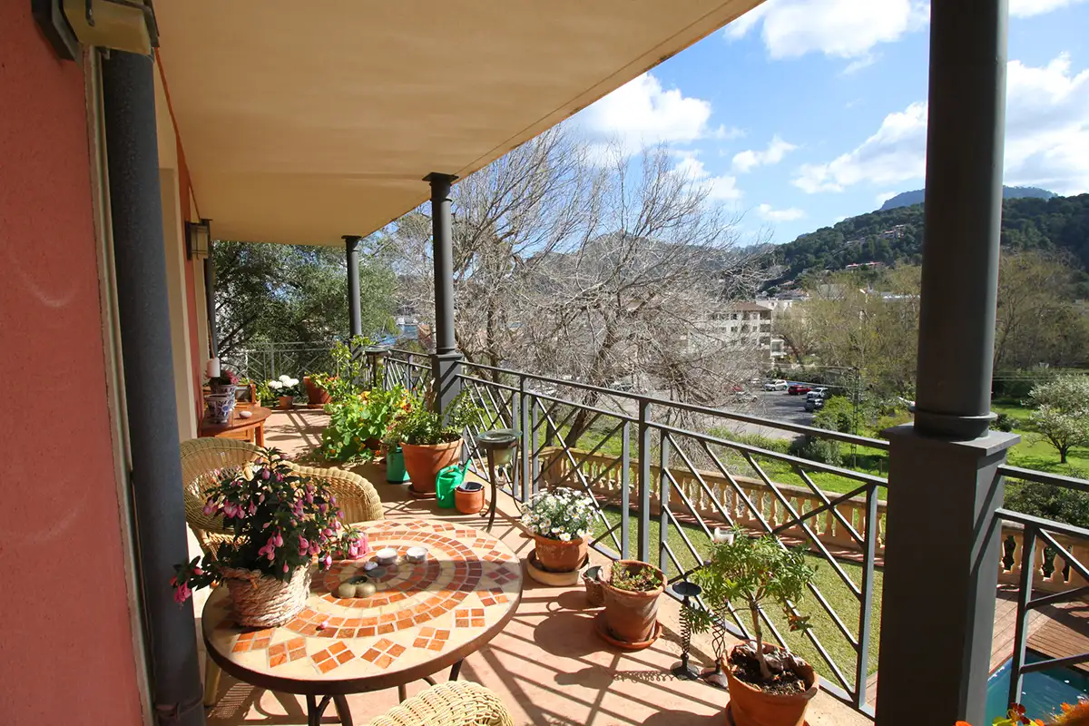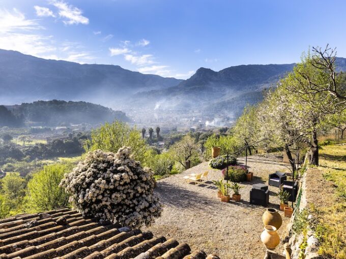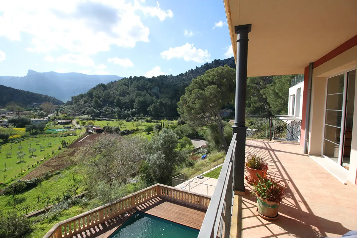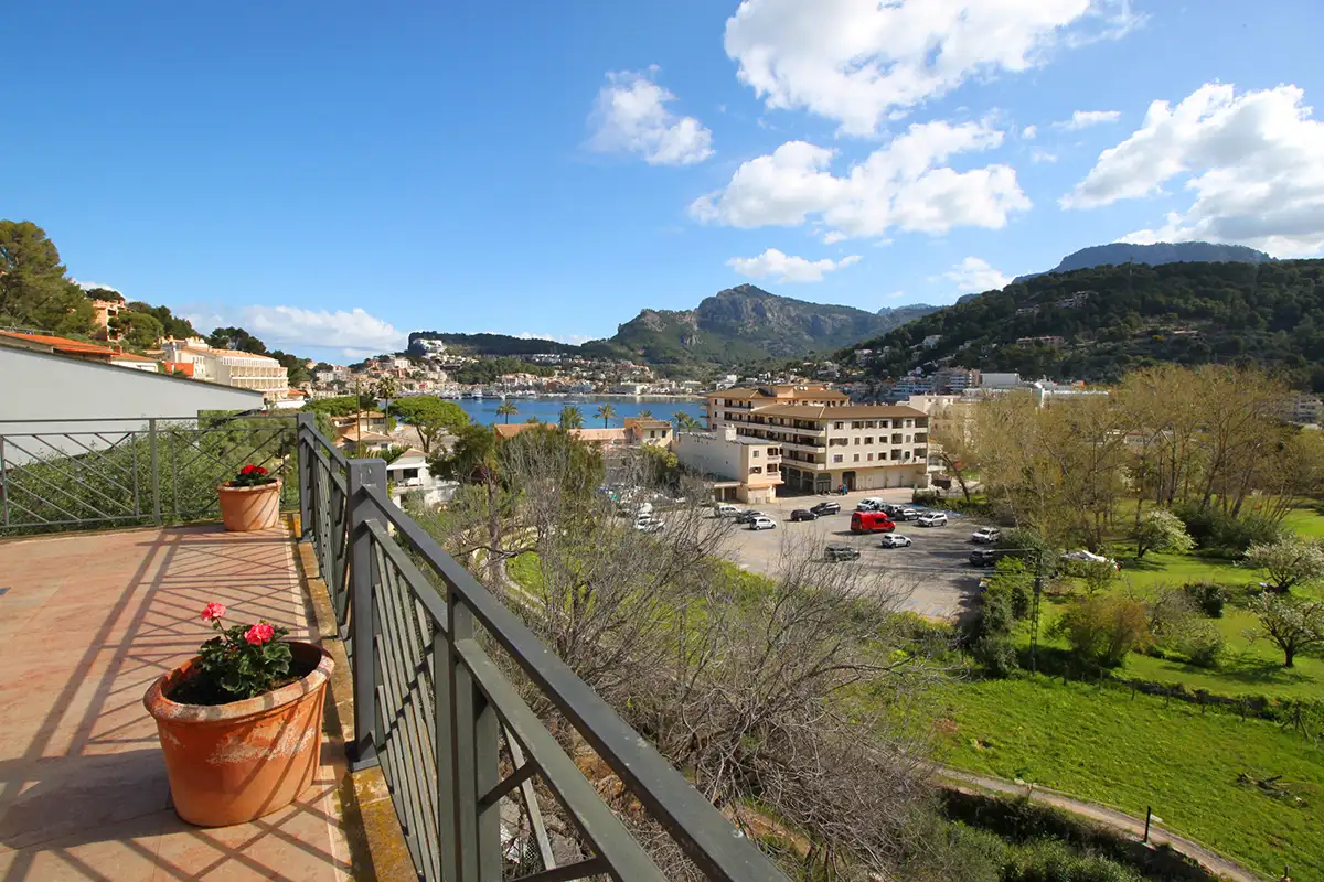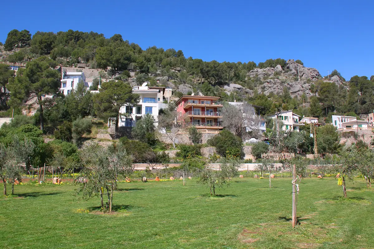 La particular disposición de la edificación permite ver simultáneamente desde sus múltiples terrazas: a la izquierda la bahía del puerto de Soller, en frente los huertos de la zona protegida de Es Camp de sa Mar, y a la derecha el valle y montañas de Sóller.